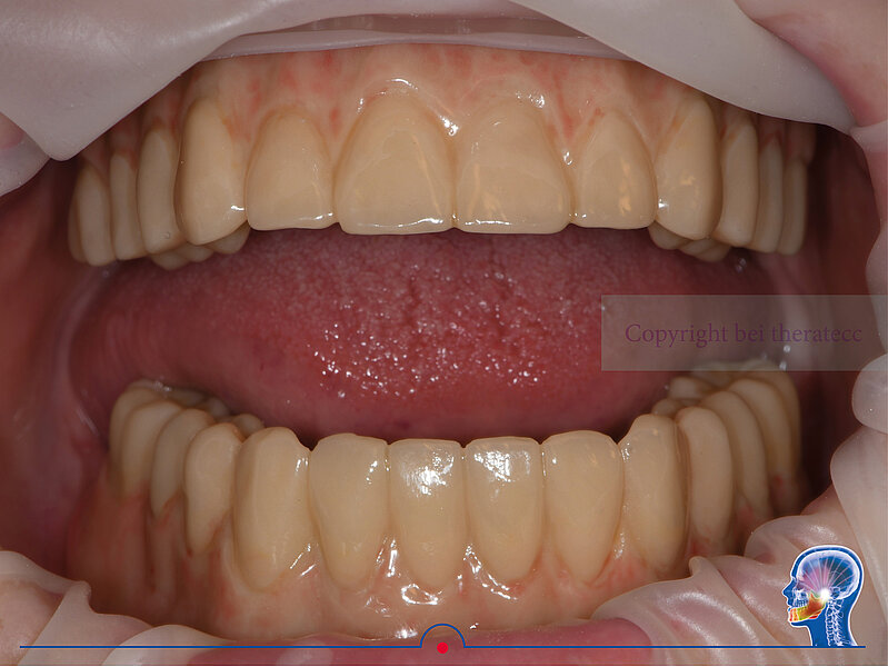 Bereits zum dritten Termin werden die Innenteleskope / Teleskopabutments definitiv eingegliedert. Damit müssen die Innenteleskope nie mehr erst am Ende mit der fertigen Prothese eingegliedert werden. Das erspart viel Stress und Ärger. Nach der Eingliederung erfolgt das spannungsfreie Verkleben der Sekundärteile mit der Tertiärstruktur direkt im Mund. Im Anschluss werden die bereits gefertigten Zweitprothesen eingegliedert. Diese beiden Prothesen werden im digitalen Workflow designt und aus einem Hochleistungs-PMMA gefräst. Die neue Bisslage, die Bisshöhe und die Gesichtsebenen sind bereits in diesen Zweitprothesen umgesetzt.