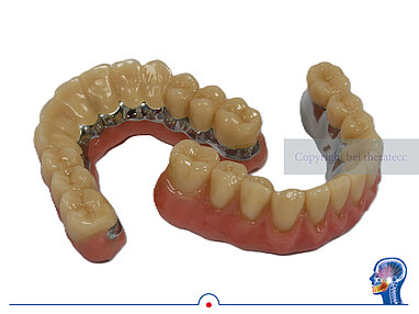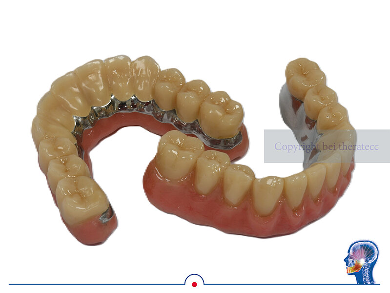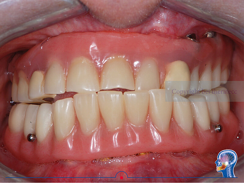 Zwei insuffiziente totale Prothesen im OK teleskopgetragen, im UK Locatorenversorgung mit einer durchaus spannenden Okklusion.