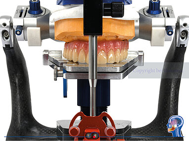 Der Vorteil dieses Systems ist, dass der Gesichtsbogen am Patienten exakt zur Camper´schen Ebene und zur Bipupillarlinie ausgerichtet werden kann. Damit ist es möglich die Gesichtsebenen eins zu eins in einen Artikulator zu übertragen. Das Oberkiefermodell steht ebenengerecht im Artikulator.