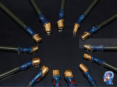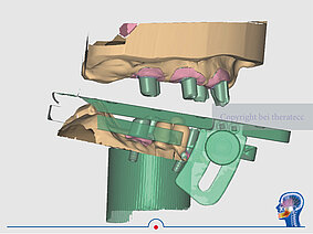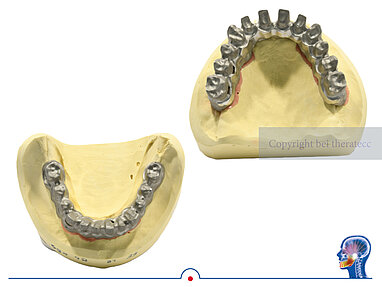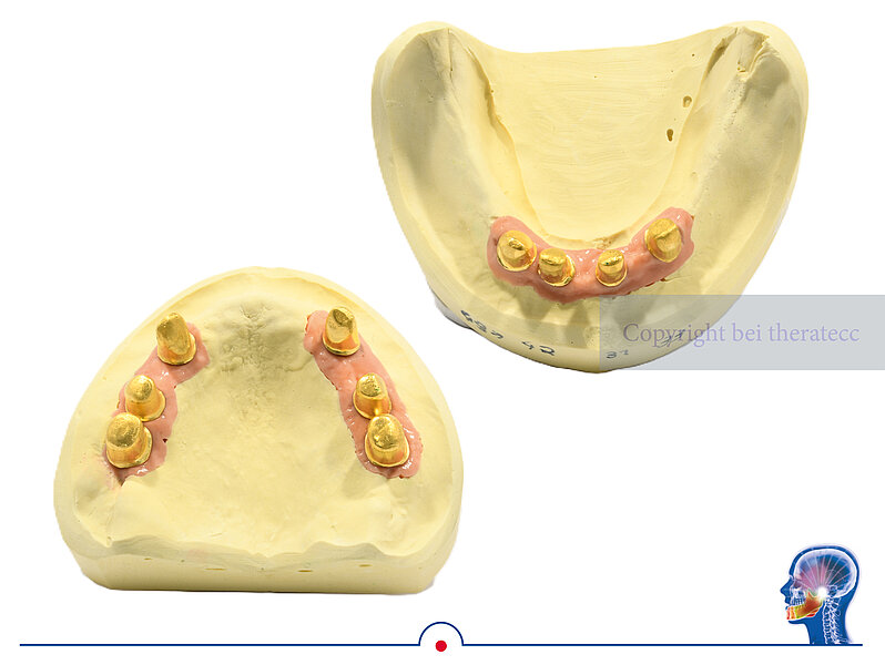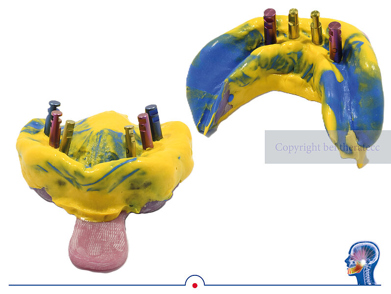 Für eine optimale Lagestabilität wurden im Oberkiefer sechs und im Unterkiefer 4 Implantate inseriert. Nach der Einheilphase erfolgte die Abformung klassisch analog.