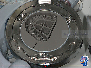 Damit stehen jetzt beide Modelle exakt im Artikulator. Das OK Modell ist zur Bipupillarlinie und zur Camper´schen Ebene ausgerichtet, die Bisshöhe und Bisslage wurde reproduzierbar bestimmt und der Artikulator wurde mit den individuellen Gelenkparametern programmiert.
